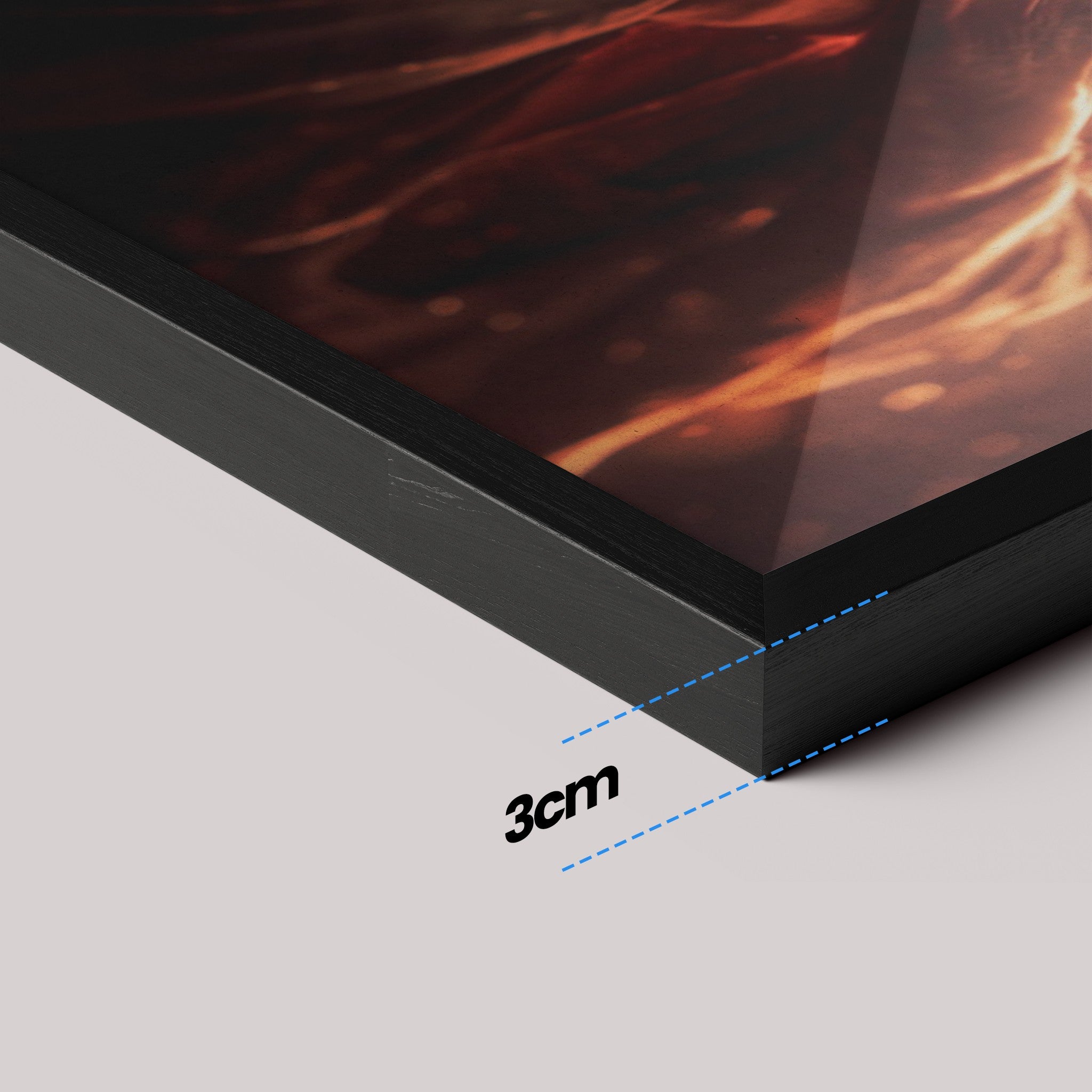 Sturdy frame (2 cm × 3 cm), same printing standard and finish. With or without glass. Ready to use.