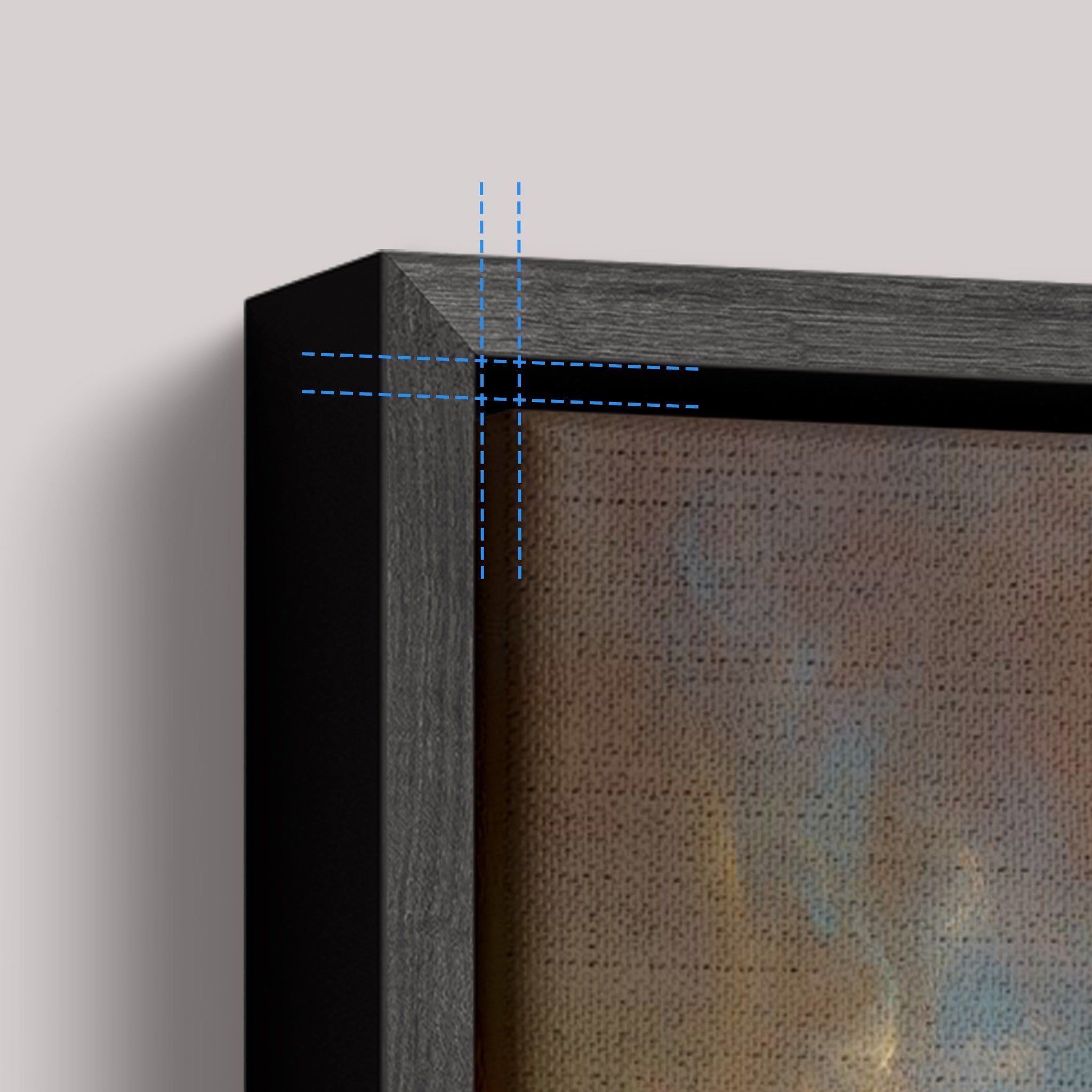 100% cotton canvas stretched on a frame, wrapped in a channel frame (0.7 cm front × 4.5 cm depth). 0.75 cm space between the canvas and frame, creating a floating effect. No glass.