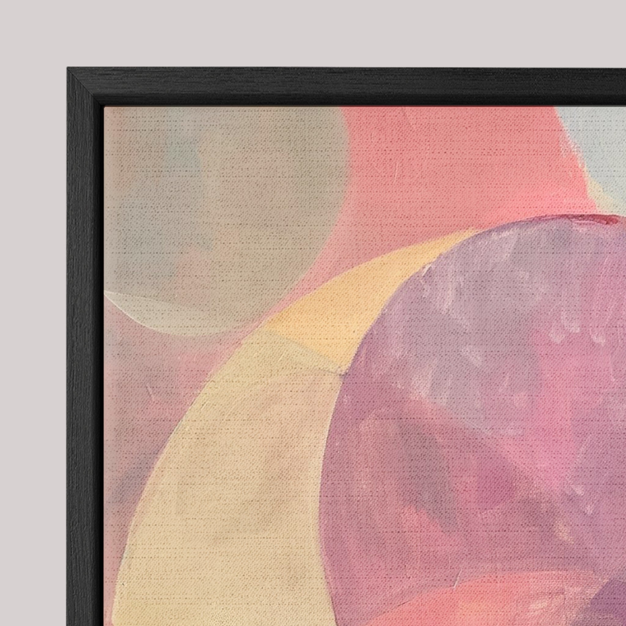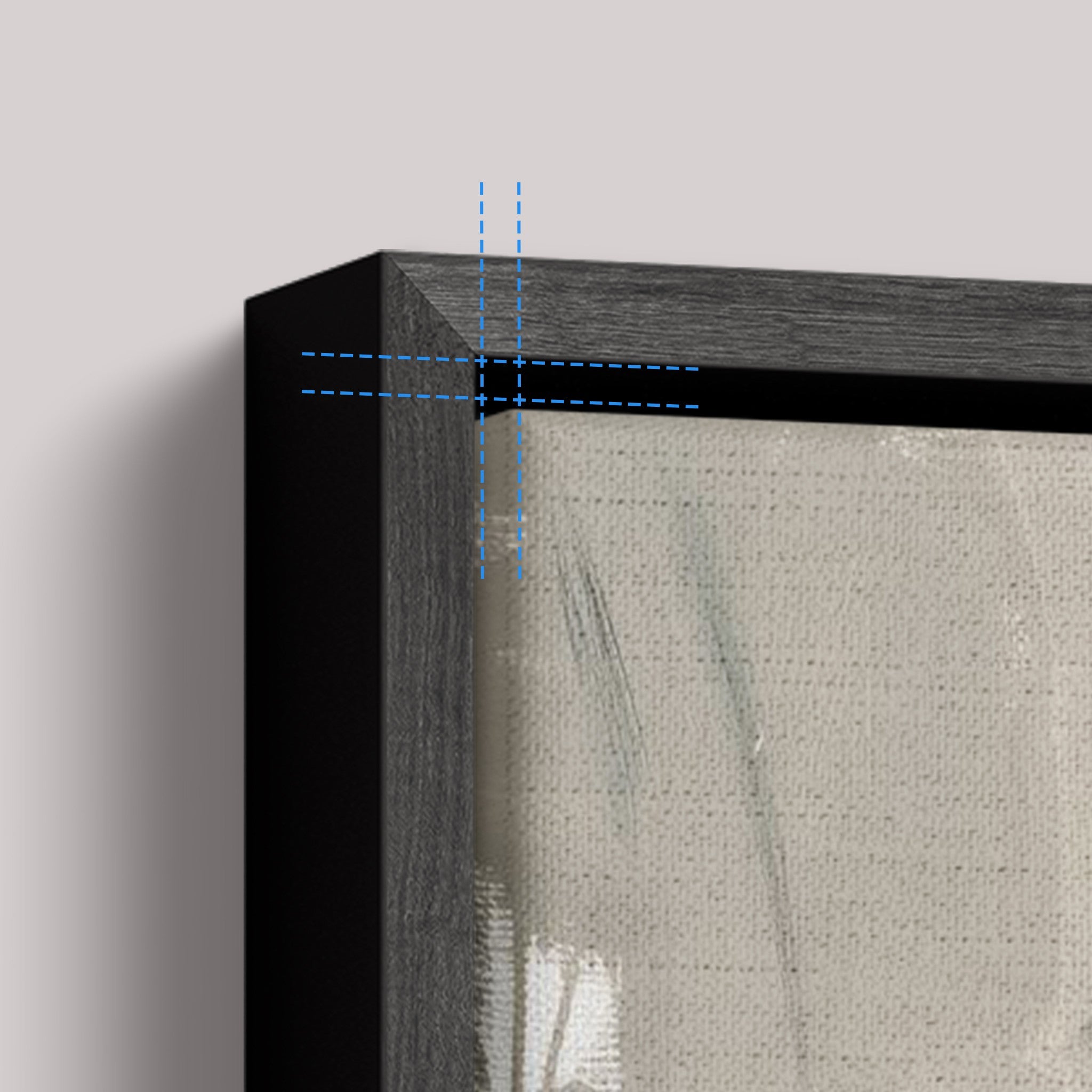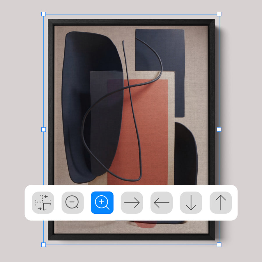 100% cotton canvas stretched on a frame, wrapped in a channel frame (0.7 cm front × 4.5 cm depth). 0.75 cm space between the canvas and frame, creating a floating effect. No glass.